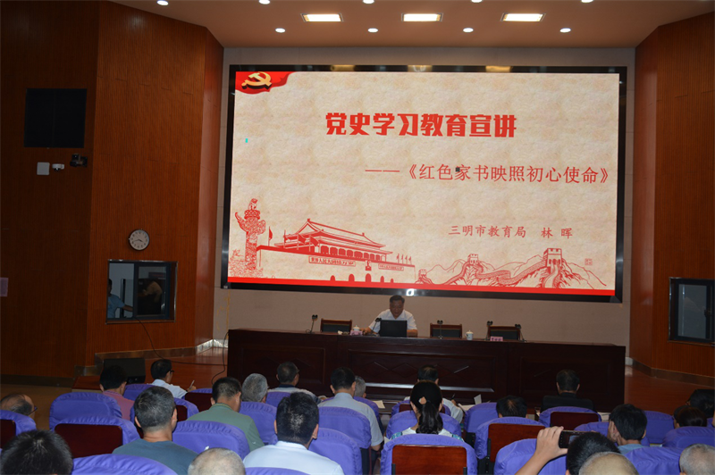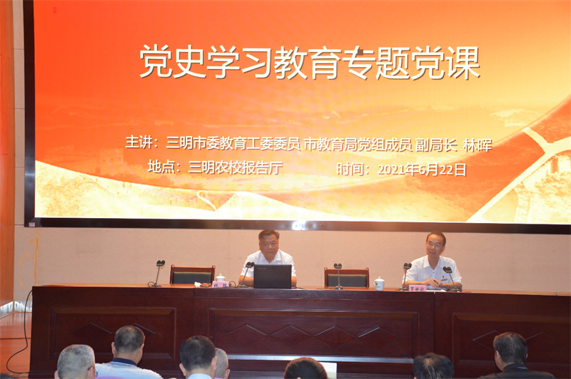 6月22日下午,中共三明市委教育工委委员、三明市教育局党组成员、副局长林晖来星空体育上党课。星空体育全体党员领导干部和部分教职员工到场聆听,党课由星空体育党委书记、校长罗世钦主持。