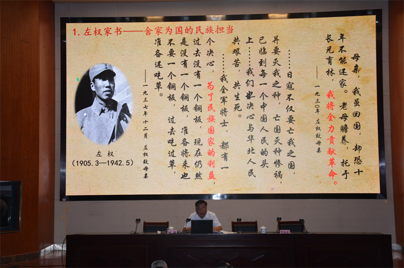 林副局长的党课结合党史学习教育宣讲以《红色家书映照初心使命》为题。他从党的百年历史中,选取了五封不同时期的看似非常平常的家书,与大家畅谈自己的感想和体会。陈觉和赵云霄的家书彰显了革命理想高于天;抗战时期八路军将军左权写给妻子刘志兰的家书字里行间折射出舍家为国的民族担当,表达了积极主动作为,勇担使命的决心;毛泽东写给杨开智的信,体现了毛主席 秉公无私的职责担当,展现了党和国家最高领袖为民掌权、清正廉洁、克己奉公、尽职尽责的担当精神;奋战在抗美援朝战场上的战士李征明写给妹妹的信是保家卫国、英勇杀敌的宣誓;习近平总书记给父亲习仲勋的信,洋溢着浓厚的赤子情怀,表达了他“无我”的精神境界和为人民美好生活而奋斗的信念。一封封红色家书映照着中国共产党党员浓厚炽烈的初心使命。