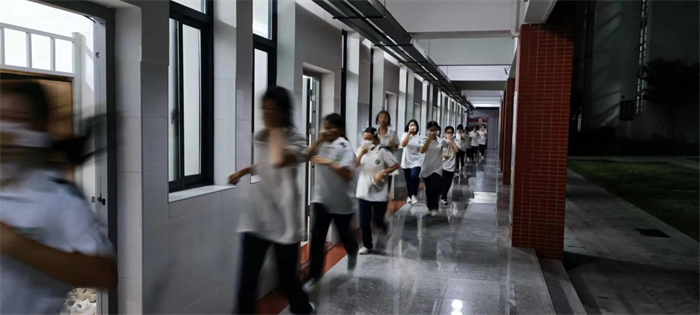 21时30分,警报声响起。德育教官组织学生用湿毛巾捂住口鼻,按照演练方案中规定的路线,弯腰前行,快速疏散,有序撤离到操场。整场演练用时1分10秒,疏散过程紧张有序、有条不紊,达到了预期的效果。